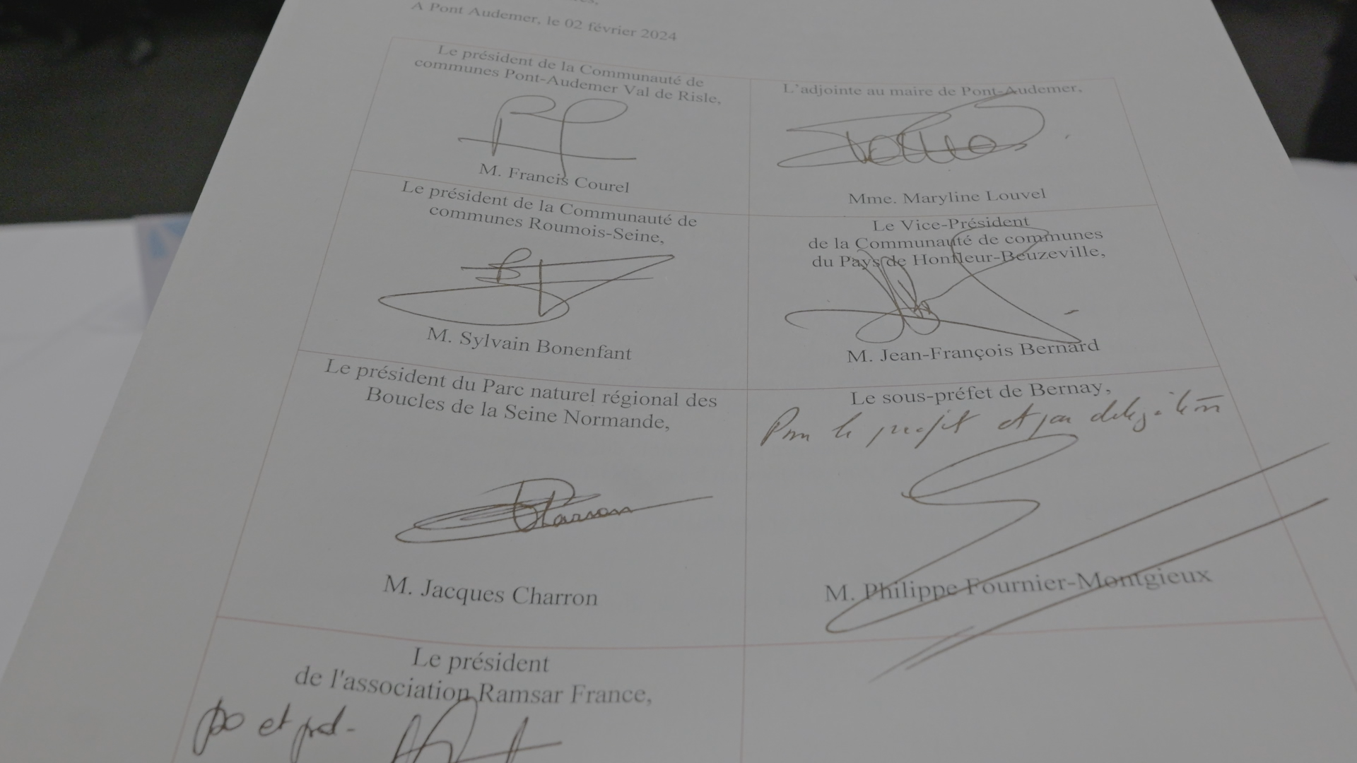 Le 2 février 2024, un événement important a eu lieu au cinéma Le Ciné pour la communauté de communes Pont-Audemer Val-de-Risle. Il s'agissait de la signature de la charte Ramsar du site Marais Vernier et Vallée de la Risle maritime. Cette cérémonie a réuni le sous-préfet de Bernay, le président de la communauté de communes Pont-Audemer Val de Risle, le président de la communauté de communes Roumois Seine, le vice-président de la communauté de communes du pays de Honfleur Beuzeville, le président du parc naturel régional des boucles de la Seine normande, le président de l'association les Amis de Ramsar, ainsi que l'adjointe au maire de Pont-Audemer chargée de l'environnement, de la transition écologique, de la propreté et de la mobilité.