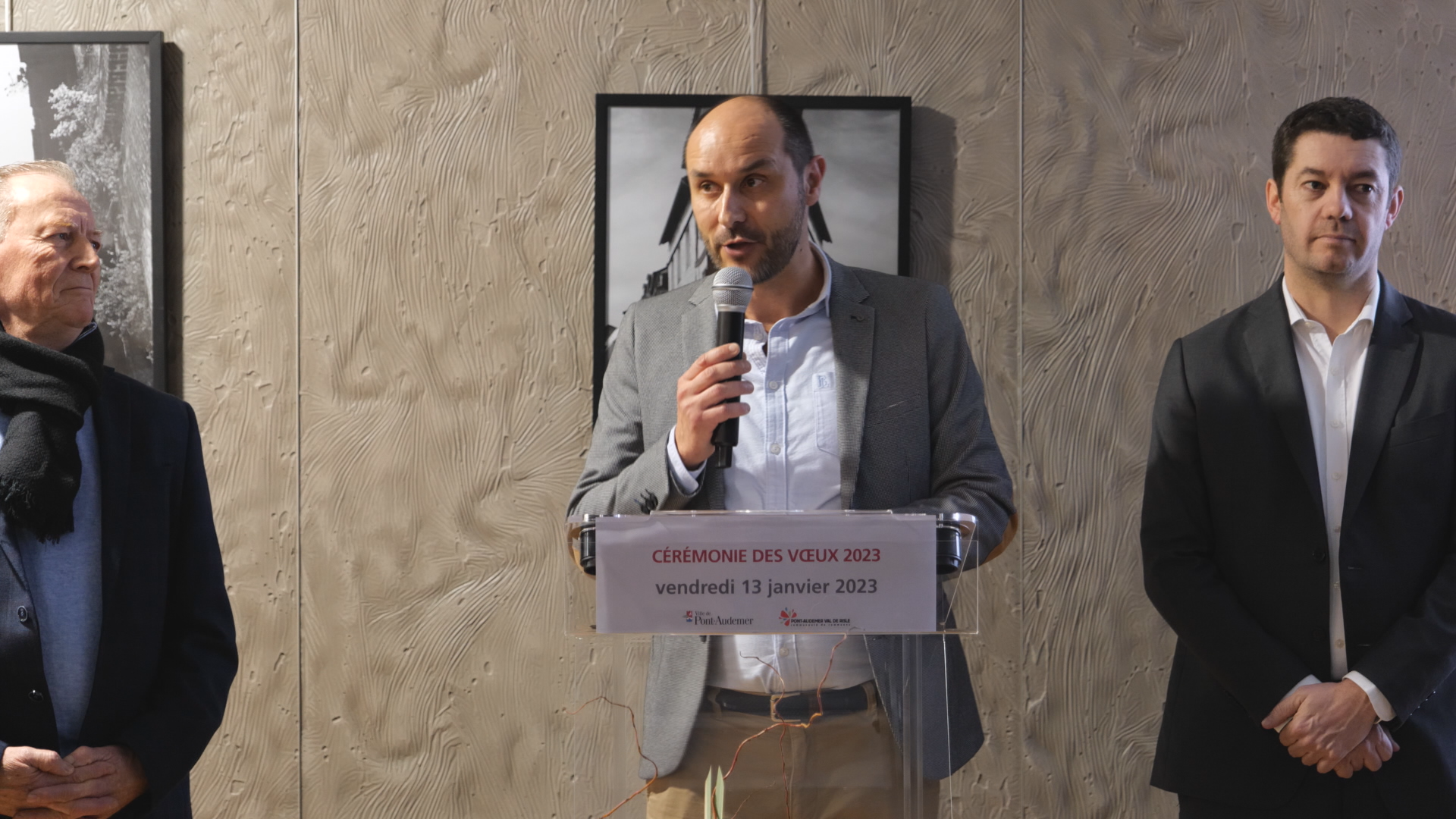 Jérémy Roseau Directeur Général des Services de la ville de Pont-Audemer et de la Communauté de Communes ainsi qu' Alexis Darmois Maire de la ville de Pont-Audemer et de Francis Courel Président de la Communauté de Communes Pont-Audemer Val de Risle ont présenté leurs vœux au personnel de la ville de Pont-Audemer et la Communauté de Communes Pont-Audemer Val de Risle