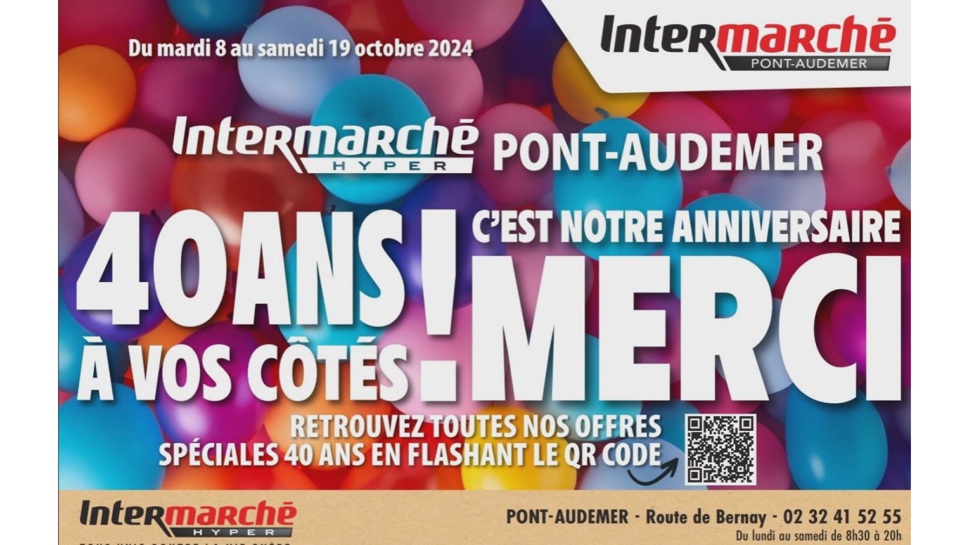 Cela fait maintenant quarante ans qu'Intermarché a ouvert ses portes à Pont-Audemer, et ils sont ravis de célébrer cette étape importante avec vous, clients et amis. Depuis son installation, l'enseigne a su s'imposer comme un acteur incontournable de la vie locale, offrant non seulement une large gamme de produits de qualité, mais aussi un service chaleureux et attentif. Pour marquer cet anniversaire, ils ont tout prévu, animations, dégustations de produits locaux, ainsi que des offres spéciales tout au long de cette célébration.