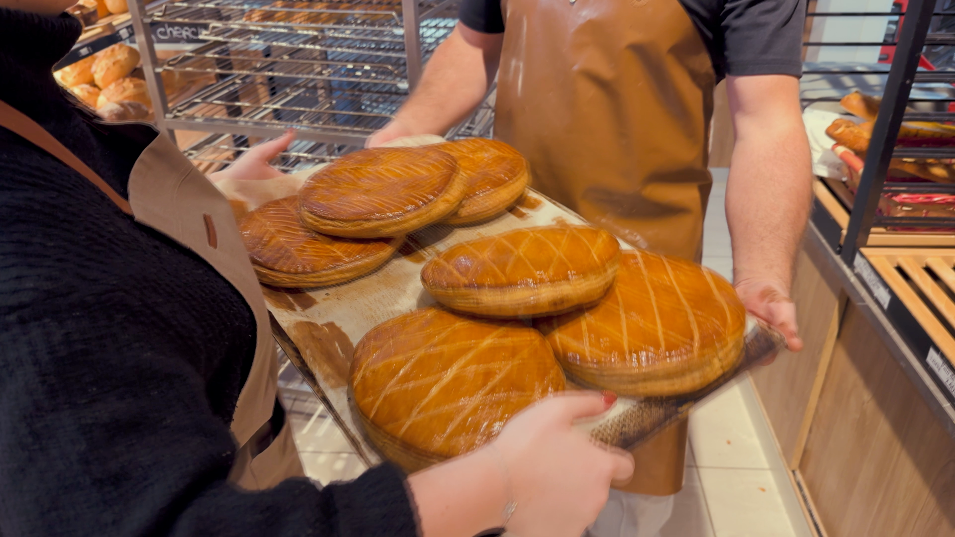 La galette des Rois confectionnée par nos pâtissiers d'Intermarché de Pont-Audemer. Elle est composée de pâte feuilletée et d'une délicieuse garniture à base d'amandes. À l'intérieur, elle renferme une ou deux fèves en faïence fabriquées par nos soins. Traditionnellement dégustée à l'Épiphanie, celui ou celle qui découvre la fève dans sa part devient le roi ou la reine du jour. Cette tradition s'accompagne souvent de rituels et de festivités familiales qui ajoutent à la convivialité de l'occasion.